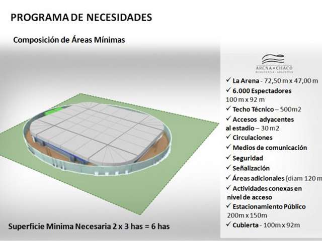 Por otro lado, Capitanich comentó que previo a la definición del predio donde se ejecutará la obra se realizaron múltiples estudios de localización dentro del ejido municipal de Resistencia y el Área Metropolitana, en el Parque Caraguatá y en el Autódromo Yaco Guarnieri, entre otros. El predio elegido, ubicado en la zona oeste de la ciudad (próximo al Aeropuerto), es propiedad del Estado provincial, lo que permitirá reducir los costos del proyecto.